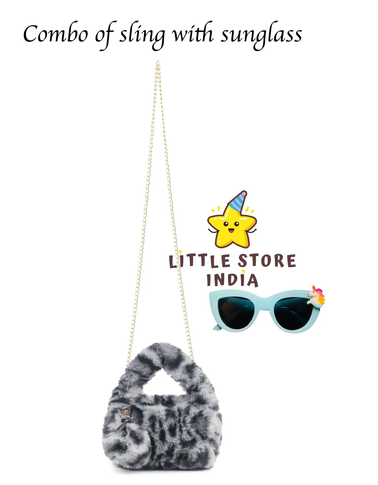 Upgrade your little girl’s style with this cute fur sling bag and stylish sunglasses combo. This trendy set includes a soft plush mini sling bag with chain strap and a fashionable kids sunglasses, perfect for creating a stylish and adorable look.