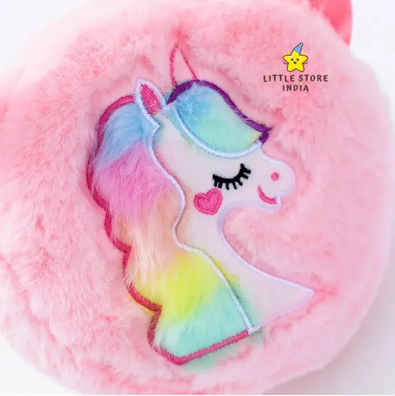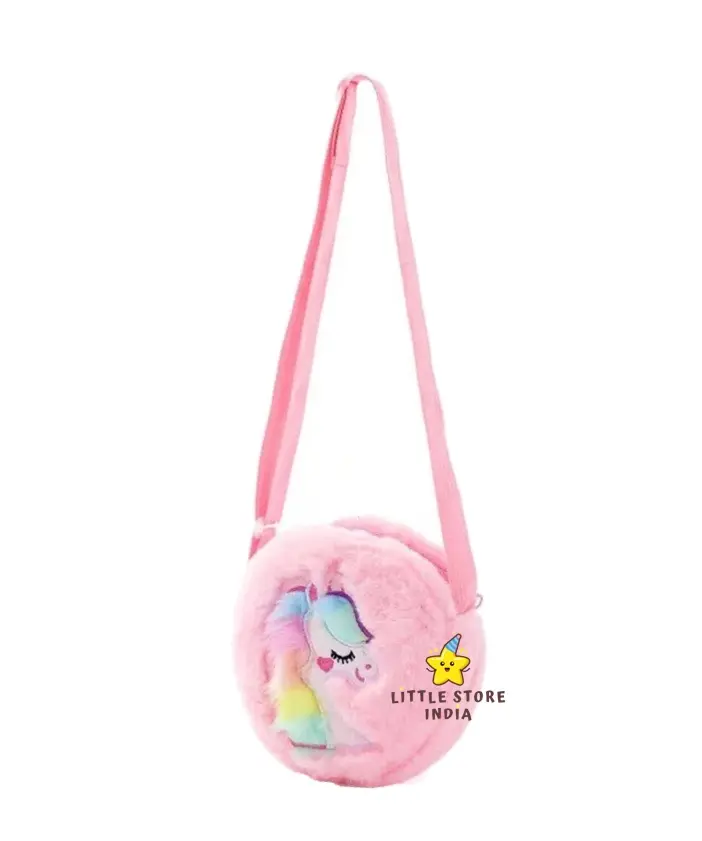 Cute furry unicorn cartoon design Sling bag made of soft plush Lightweight and comfortable, adjustable shoulder strap Round and stylish shoulder bag Perfect for girls, toddlers, and young children